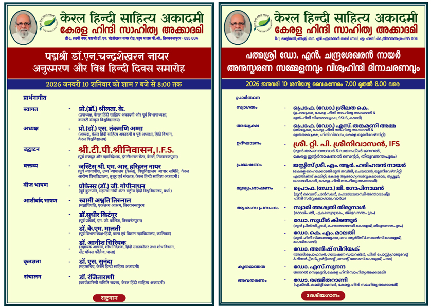 We request you to kindly join the online Anusmarana Samellan of late Padma Shri Dr N Chandrasekaran Nair (Founder and Chairman, Kerala Hindi Sahitya Academy (KHSA)) and Vishwa Hindi Divas on Saturday, 10th January 2026 at 7.00 PM.