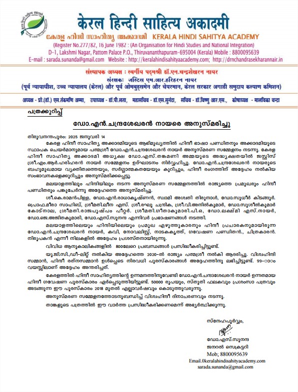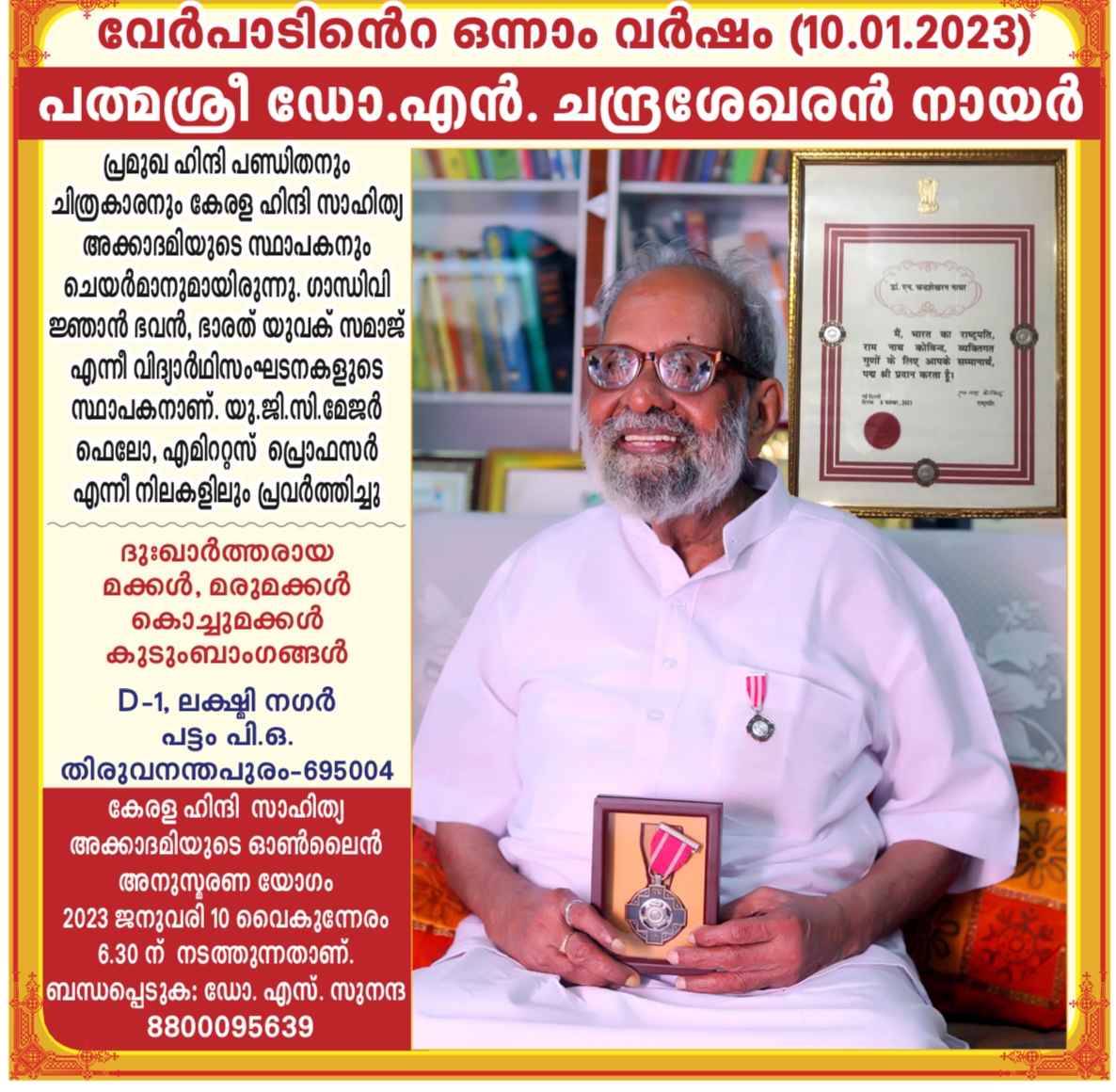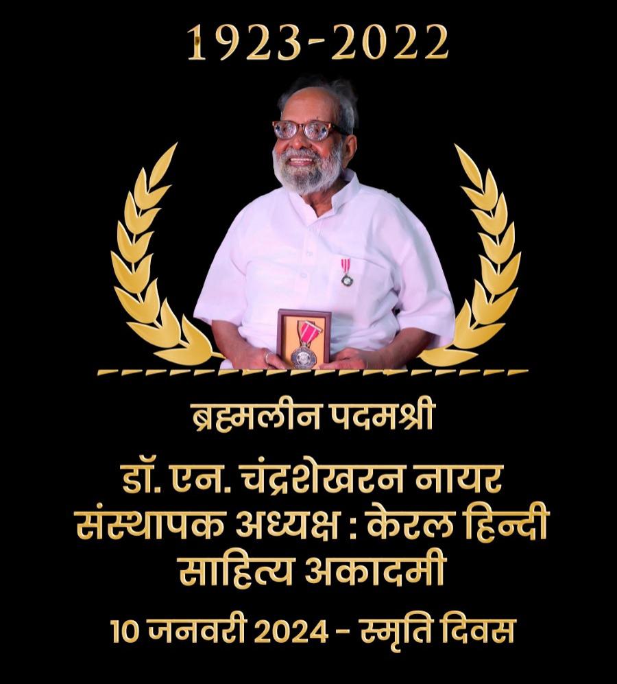 Kerala Hindi Sahitya Academy (KHSA) organized the 2nd Death Anniversary of late Padma Shri Dr N Chandrasekharan Nair, Founder Chairman, KHSA on 10th January 2024.