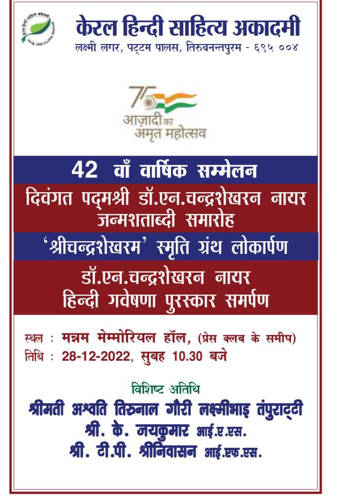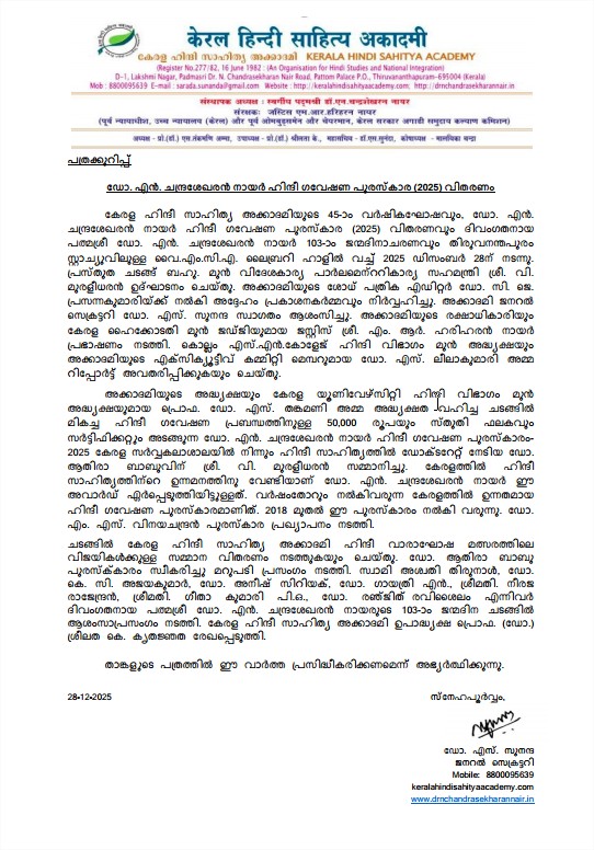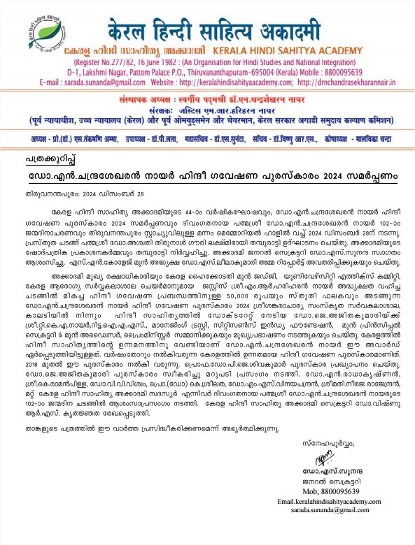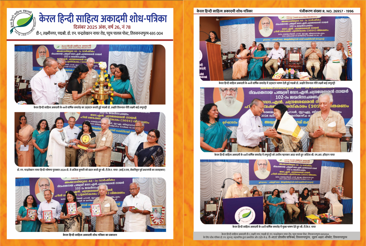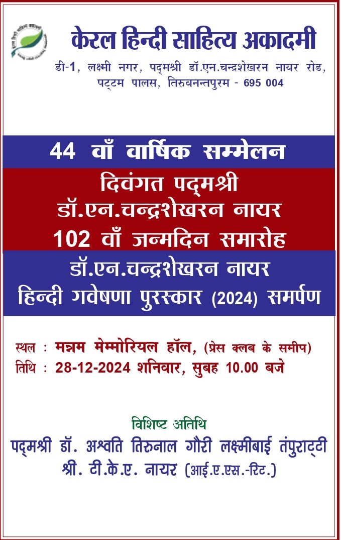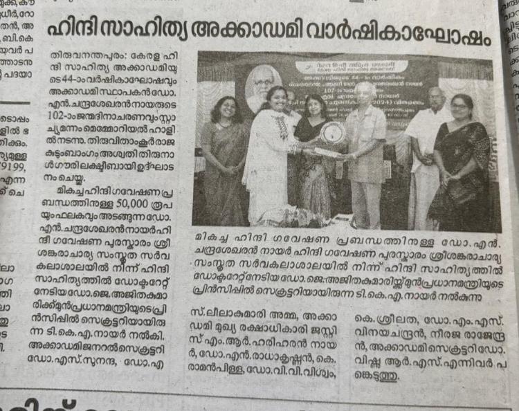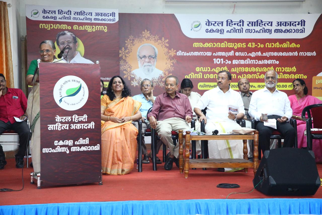 Kerala Hindi Sahitya Academy (KHSA) organized its 43rd Annual General Meeting (AGM), 101 Birthday Celebration of the late Padma Shri Dr N Chandrasekharan Nair and Presentation of Dr N Chandrasekharan Nair Hindi Gaveshana Puraskara 2023 on Thursday, 28th December 2023 at 10.00 A.M. at Manam Memorial Hall, Statue, Thiruvananthapuram, Kerala. Dr N Chandrasekharan Nair instituted an Award for the best Hindi Ph.D. Thesis in Kerala in 2018. The Award which is of Rs 50000/-, Citation and Certificate is given every year.