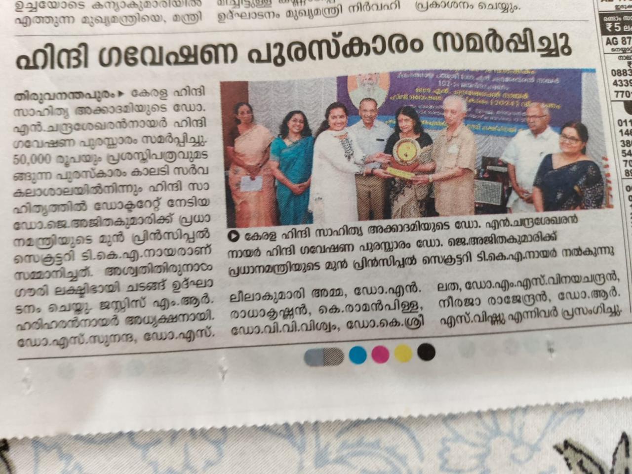 This is the highest Award ever given for Hindi Thesis in Kerala