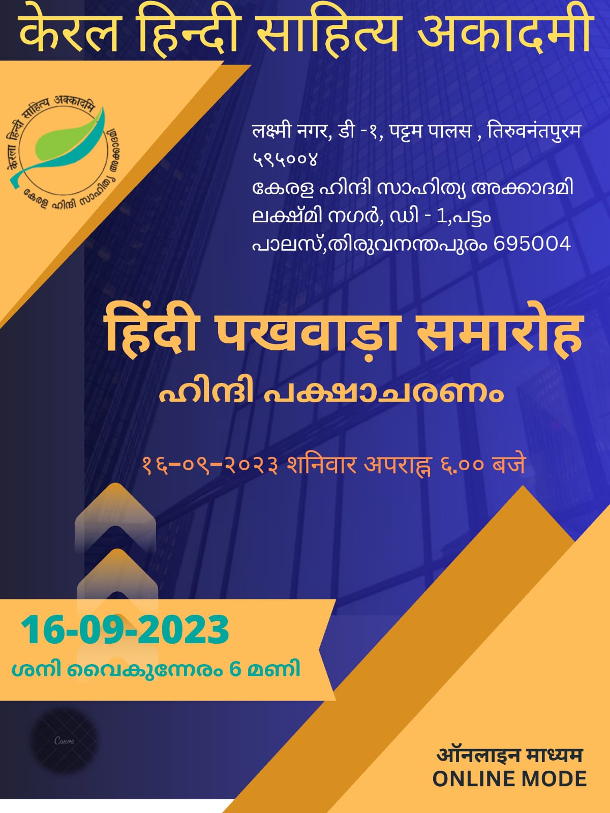 केरल हिंदी साहित्य अकादमी हिन्दी पखवाड़ा समारोह *१६-०९-२०२३ स्वागत भाषण एवं संचालन : डॉ.विष्णु .आर .एस ( कार्यकारी संपादक , के हि सा अकादमी ) अध्यक्ष भाषण : प्रोफ (डॉ) .एस . तंकमणि अम्मा(अध्यक्षा, के हि सा अकादमी ) उद्घाटन : जस्टिस . एम .आर . हरिहरन नायर *(पूर्व न्यायाधीश ,उच्च न्यायालय( केरल),पूर्व ओंबुडसमेन,अध्यक्ष , केरल सरकार अगाड़ी समुदाय कल्याण कमिशन एवं संरक्षक ,केरल हिंदी साहित्य अकादमी ) बीज भाषण : प्रोफ .(डॉ). रवीन्द्र कुमार( भूतपूर्व कुलपति , सि .सि .सि विश्वविद्यालय , मीरट ,उत्तर प्रदेश ) * विशिष्ट भाषण : श्रीमति .कमलेश कुमारी (संरक्षक ,विश्व शांति आंदोलन ट्रस्ट ) आशीर्वाद भाषण : प्रोफ .ए .मीरा साहिब (पूर्व प्राचार्य ,सरकारी महिला महाविद्यालय ,त्रिवेंद्रम) प्रोफ (डॉ) . के . श्रीलता (अध्यक्षा ,हिंदी विभाग , एस एस यु एस , कालटी) डॉ पि.लता (उपाध्यक्षा , के हि सा अकादमी) डॉ . पि .जे .शिवकुमार( प्राचार्य , पी जी . सेंटर , के हि . प्रचारसभा) डॉ पंडित बन्ने(अध्यक्ष ,हिंदी विभाग ,भारत महाविद्यालय , शोलापुर) डॉ . सुशील कोटनाला (प्रदेश प्रमुख , डॉ . रामसिंह राष्ट्रीय शोध संस्थान ' उत्तराखंड इकाई ) प्रोफ(डॉ). के पि .उषा कुमारी ( पूर्व प्रोफसर ,हिंदी विभाग ,एम .जी कॉलेज ) डॉ . एस .लीलाकुमारी अम्मा (पूर्व अध्यक्षा ,एस .एन कॉलेज ,कोल्लम ) कृतज्ञता : डॉ. एस . सुनंदा ( कोषाध्यक्षा , के हि सा अकादमी) |