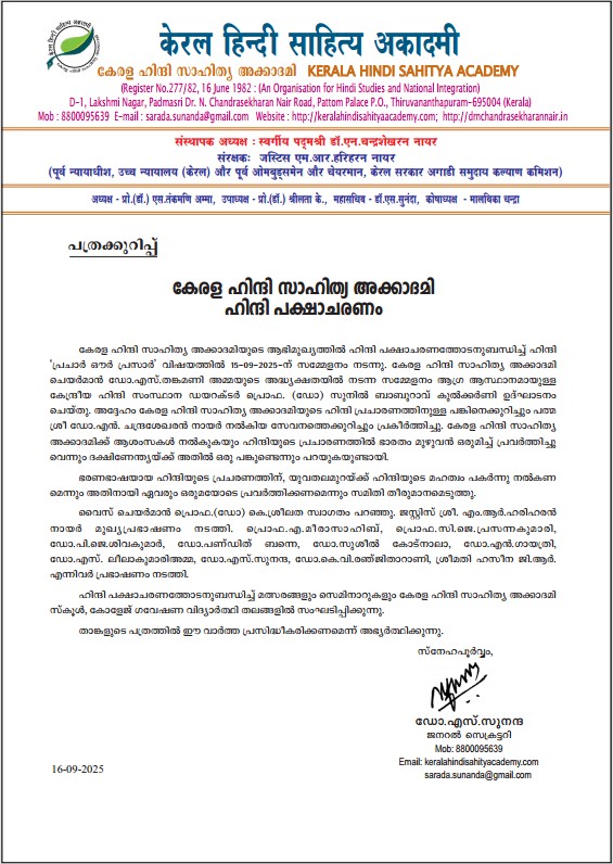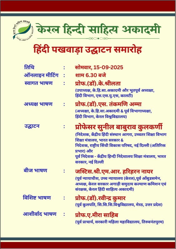 | केरल हिंदी साहित्य अकादमी *हिन्दी पखवाड़ा समारोह ** 18-09-2024, बुधवार स्वागत भाषण एवं संचालन : डॉ. रंजीता रानी के वी (कार्यकारिणी समिति, के हि सा अकादमी ) अध्यक्ष भाषण : प्रोफ (डॉ) .एस . तंकमणि अम्मा(अध्यक्षा, के हि सा अकादमी ) *उद्घाटन : जस्टिस . एम .आर . हरिहरन नायर **(पूर्व न्यायाधीश ,उच्च न्यायालय( केरल),पूर्व ओंबुडसमेन,अध्यक्ष , केरल सरकार अगाड़ी समुदाय कल्याण कमिशन एवं संरक्षक ,केरल हिंदी साहित्य अकादमी ) *बीज भाषण : प्रोफ .(डॉ). रवीन्द्र कुमार( भूतपूर्व कुलपति , सि .सि .सि विश्वविद्यालय , मीरट ,उत्तर प्रदेश ) ** विशिष्ट भाषण : श्रीमति .कमलेश कुमारी (संरक्षक ,विश्व शांति आंदोलन ट्रस्ट ) आशीर्वाद भाषण : प्रोफ .ए .मीरा साहिब (पूर्व प्राचार्य ,सरकारी महिला महाविद्यालय ,त्रिवेंद्रम) प्रोफ (डॉ) . के . श्रीलता (अध्यक्षा ,हिंदी विभाग , एस एस यु एस , कालटी) डॉ पि.लता (उपाध्यक्षा , के हि सा अकादमी) डॉ . पि .जे .शिवकुमार( प्राचार्य , पी जी . सेंटर , के हि . प्रचारसभा) डॉ पंडित बन्ने(अध्यक्ष ,हिंदी विभाग ,भारत महाविद्यालय , शोलापुर) डॉ . सुशील कोटनाला (प्रदेश प्रमुख , डॉ . रामसिंह राष्ट्रीय शोध संस्थान ' उत्तराखंड इकाई ) प्रोफ(डॉ). के पि .उषा कुमारी ( पूर्व प्रोफसर ,हिंदी विभाग ,एम .जी कॉलेज ) डॉ . एस .लीलाकुमारी अम्मा (पूर्व अध्यक्षा ,एस .एन कॉलेज ,कोल्लम ) कृतज्ञता : डॉ. एस . सुनंदा ( महासचिव , के हि सा अकादमी) |