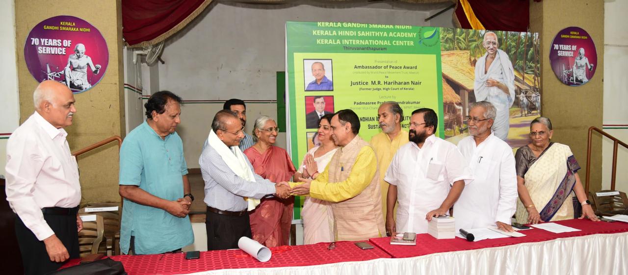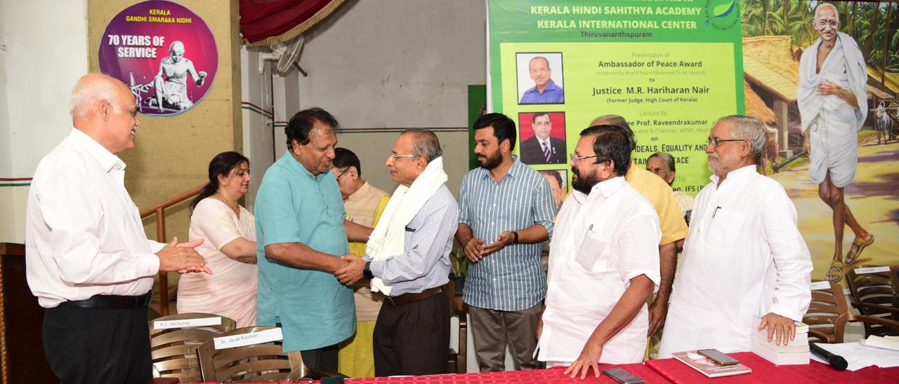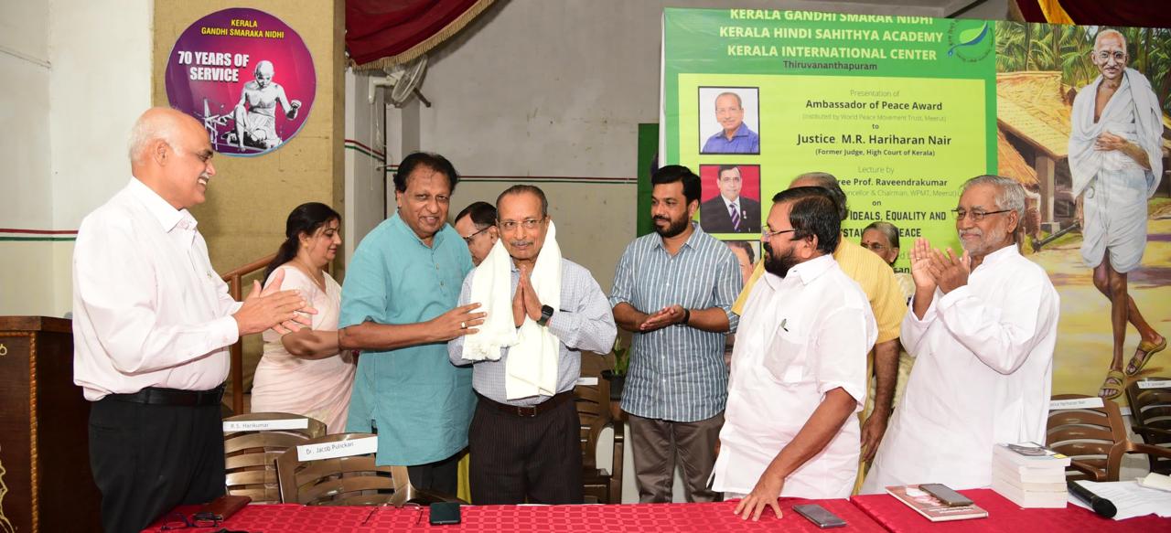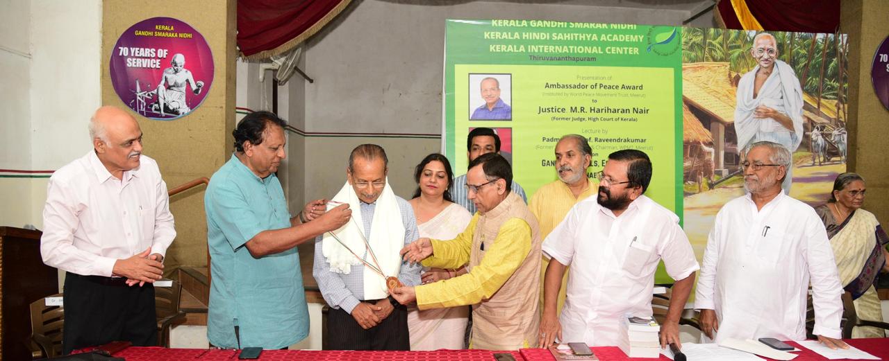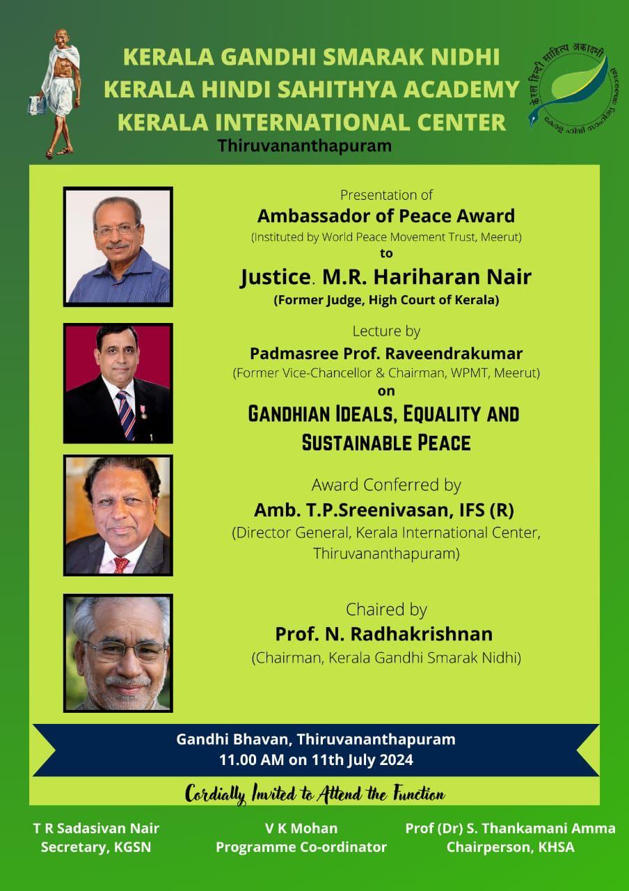 Prayer: Smt. Rajapushpam Presidential Address: Dr. N. Radhakrishnan, (Chairman, Kerala Gandhi Smaraka Nidhi) Speech on Investiture: Dr. Ravindra Kumar, Secretary General, World Peace Movement, Meerut and former Vice Chancellor, CCC University,Meerut Conferment and speech Ambassador T.P. Sreenivasan, Director General, Kerala International Centre, Thiruvananthapuram. Acceptance Speech: Justice M.R. Hariharan Nair,Former Judge, High Court of Kerala). Talk on Gandhian ideals,Equality &Sustainable peace. Dr. Ravindra Kumar Felicitation speeches: 1. Prof: (Dr) S Thankamoni Amma, Chairperson, Kerala Hindi Sahitya Academy. 2. T.R. Sadasivan Nair, Secretary, Kerala Gandhi Smaraka Nidhi. 3. Any other person representing any organization Vote of Thanks: V.K. Mohan, Programme Co-ordinator We are happy to inform you that Justice M R Hariharan Nair, Former Judge, High Court of Kerala, will be presented “Ambassador of Peace Award” instituted by World Peace Movement Trust, Meerut on 11th July 2024 at 11.00 a.m. at Gandhi Bhavan, Thiruvananthapuram. The function is jointly organised by Kerala Hindi Sahitya Academy, Kerala Gandhi Smarak Nidhi and Kerala International Centre. On behalf of KHSA, we request you all to kindly attend the presentation function. |