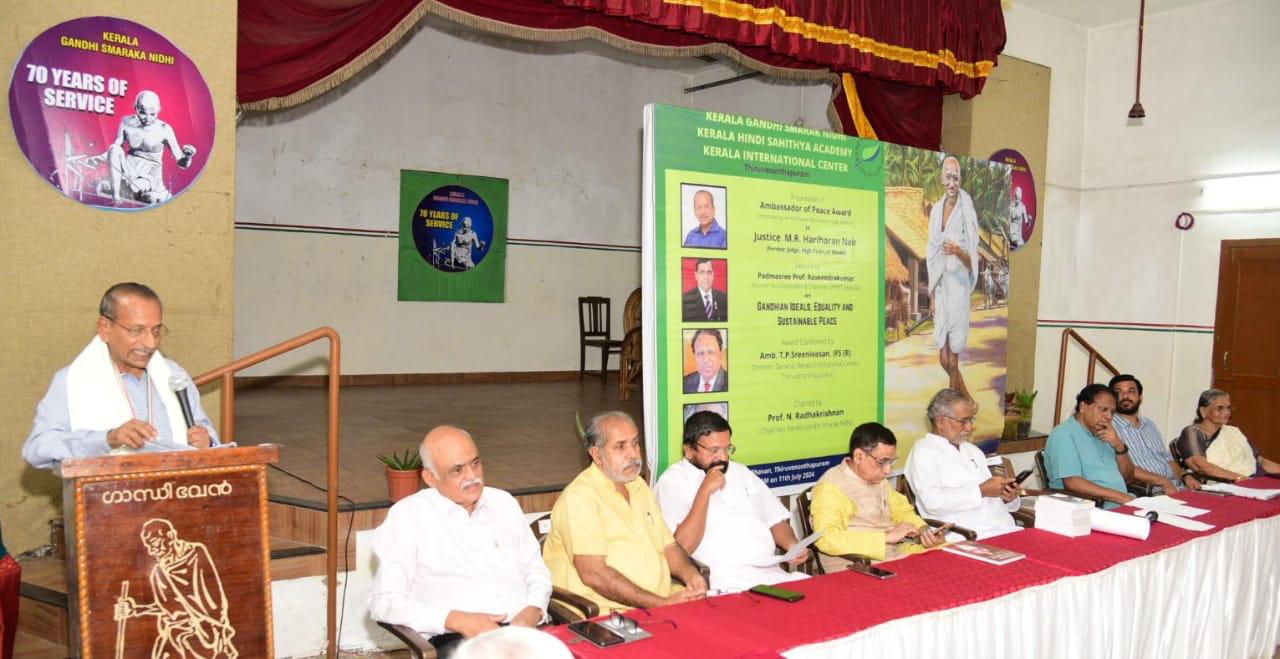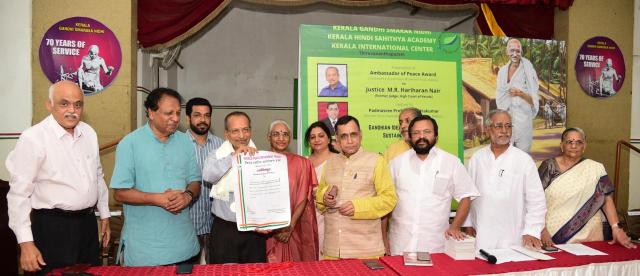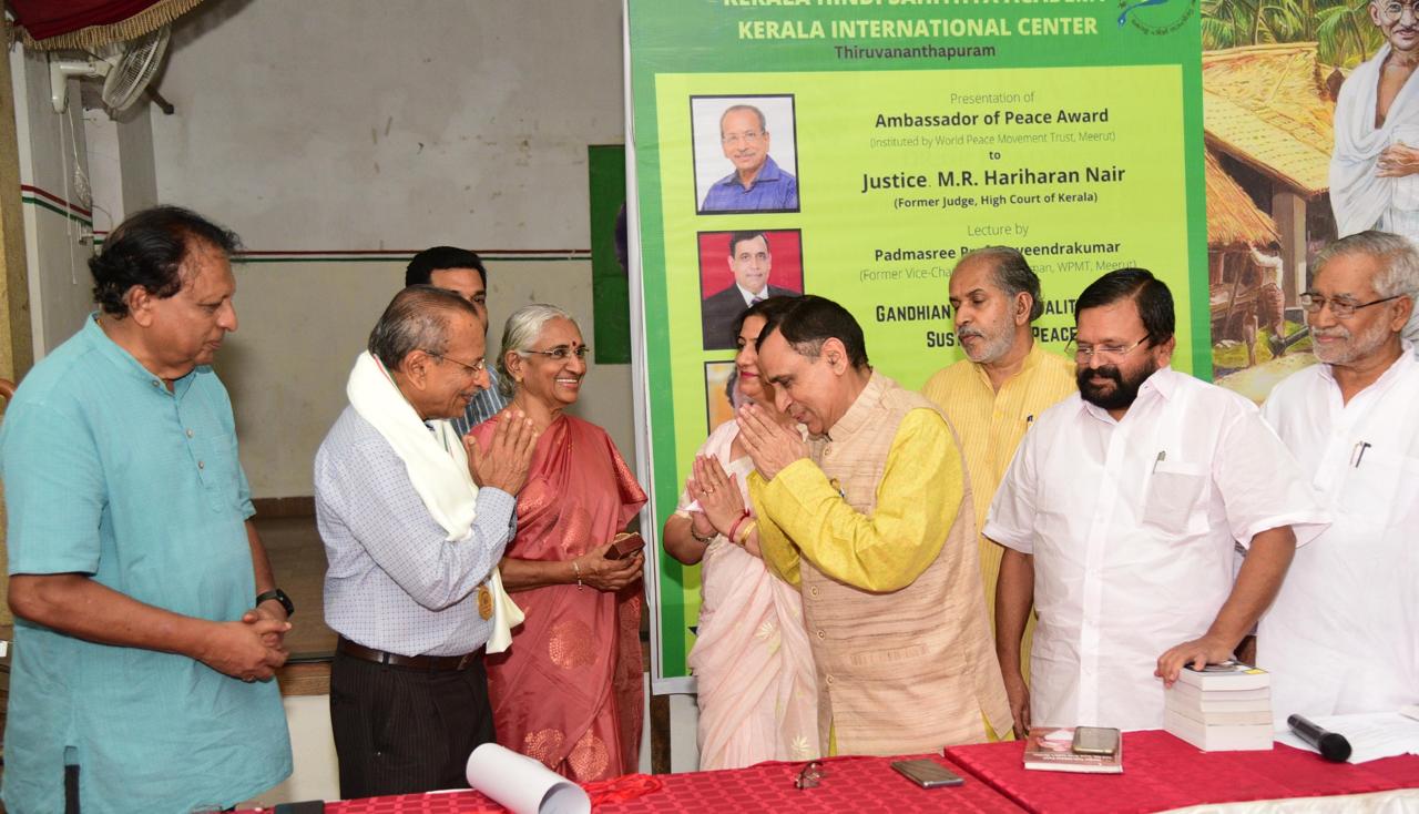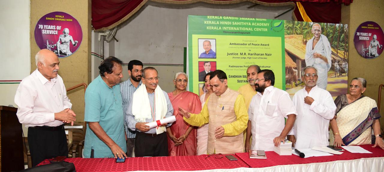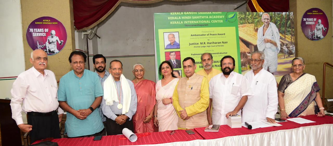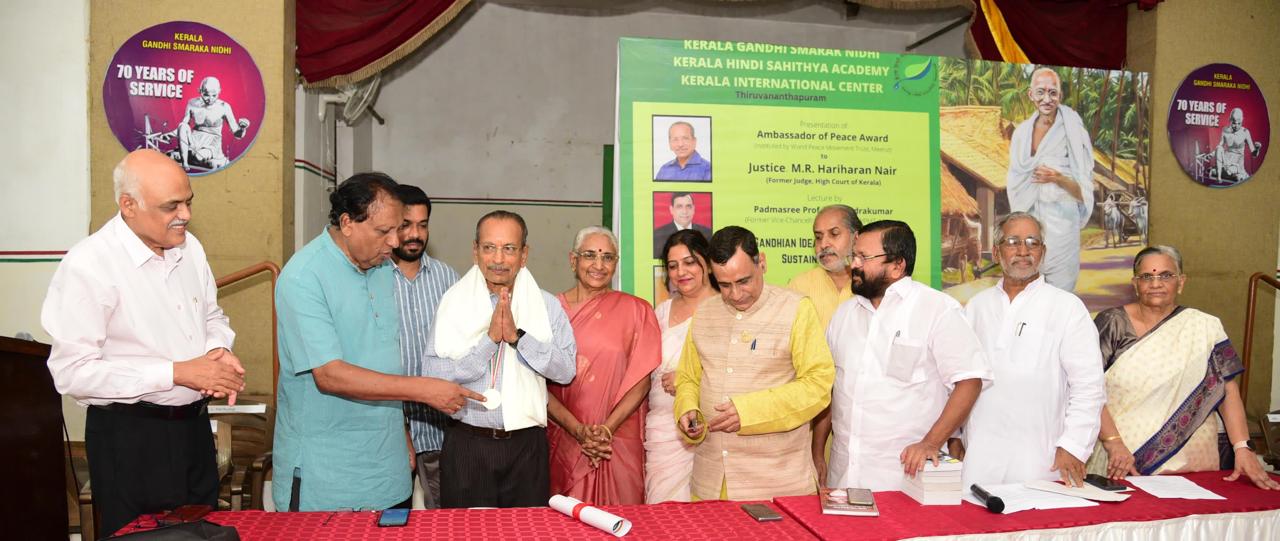 Prayer: Smt. Rajapushpam Presidential Address: Dr. N. Radhakrishnan, (Chairman, Kerala Gandhi Smaraka Nidhi) Speech on Investiture: Dr. Ravindra Kumar, Secretary General, World Peace Movement, Meerut and former Vice Chancellor, CCC University,Meerut Conferment and speech Ambassador T.P. Sreenivasan, Director General, Kerala International Centre, Thiruvananthapuram. Acceptance Speech: Justice M.R. Hariharan Nair,Former Judge, High Court of Kerala). Talk on Gandhian ideals,Equality &Sustainable peace. Dr. Ravindra Kumar Felicitation speeches: 1. Prof: (Dr) S Thankamoni Amma, Chairperson, Kerala Hindi Sahitya Academy. 2. T.R. Sadasivan Nair, Secretary, Kerala Gandhi Smaraka Nidhi. 3. Any other person representing any organization Vote of Thanks: V.K. Mohan, Programme Co-ordinator We are happy to inform you that Justice M R Hariharan Nair, Former Judge, High Court of Kerala, will be presented “Ambassador of Peace Award” instituted by World Peace Movement Trust, Meerut on 11th July 2024 at 11.00 a.m. at Gandhi Bhavan, Thiruvananthapuram. The function is jointly organised by Kerala Hindi Sahitya Academy, Kerala Gandhi Smarak Nidhi and Kerala International Centre. On behalf of KHSA, we request you all to kindly attend the presentation function. |