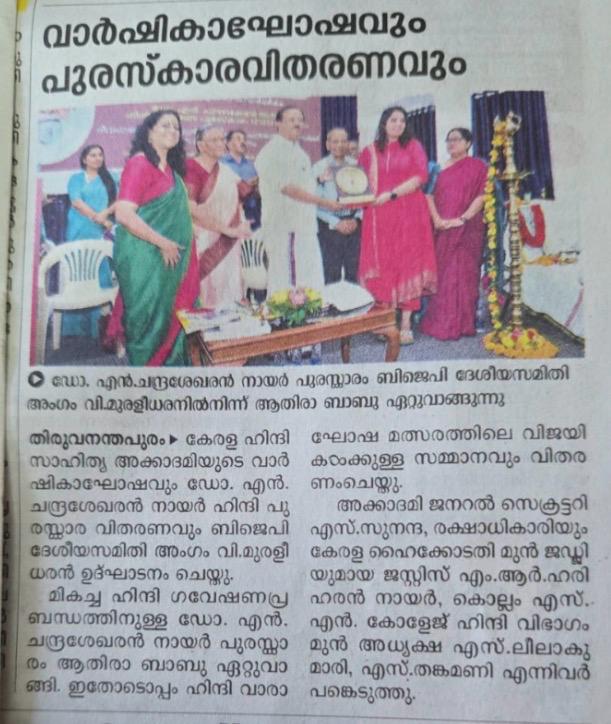 Kerala Hindi Sahitya Academy (KHSA) organized its 43rd Annual General Meeting (AGM), 101 Birthday Celebration of the late Padma Shri Dr N Chandrasekharan Nair and Presentation of Dr N Chandrasekharan Nair Hindi Gaveshana Puraskara 2023 on Thursday, 28th December 2023 at 10.00 A.M. at Manam Memorial Hall, Statue, Thiruvananthapuram, Kerala. Dr N Chandrasekharan Nair instituted an Award for the best Hindi Ph.D. Thesis in Kerala in 2018. The Award which is of Rs 50000/-, Citation and Certificate is given every year.