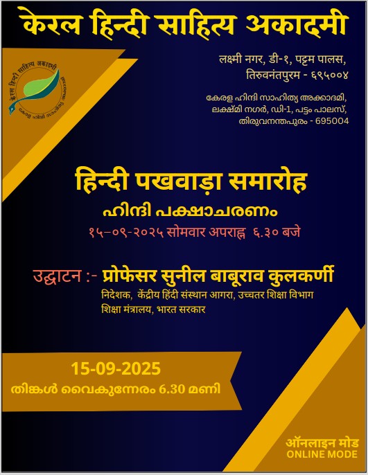 Venue : Kerala Hindi Sahithya Academy , Lekshmi Nagar, Pattom, Trivandrum-4