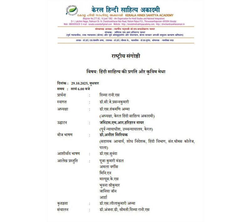 We are cordially inviting you for the online Rashtriya Sangosti scheduled today (Wednesday, 29th October 2025) at 6.00 PM. organized by the Kerala Hindi Sahitya Academy (KHSA).