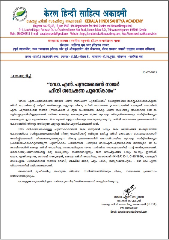 പ്രബന്ധത്തിന് അൻപതിനായിരം രൂപയുടെ ഡോ.എൻ.ചന്ദ്രശേഖരൻ നായർ ഹിന്ദി ഗവേഷണ പുരസ്കാരം ഏർപ്പെടുത്തി..ഹിന്ദി